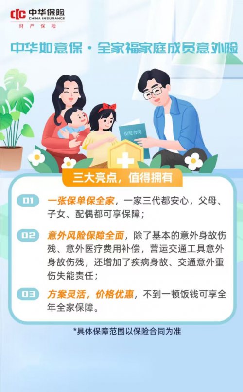 要是嫌给爸妈、娃、另一半挨个买保险太折腾,“中华如意保・全家福” 就是 “省心王”—— 三张亮点直接戳中家庭刚需:一张保单保三代,父母、配偶、子女都能罩住;保障不止意外,还加了疾病身故、交通重伤失能;关键是 “不到一顿饭钱” 就能保全年,把 “全家安心” 打包得明明白白。
