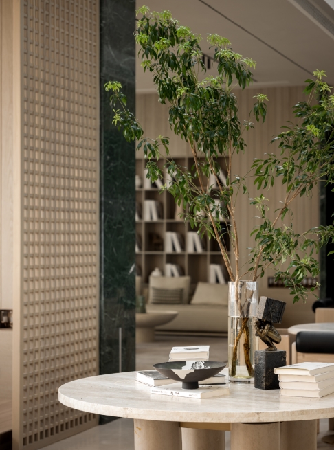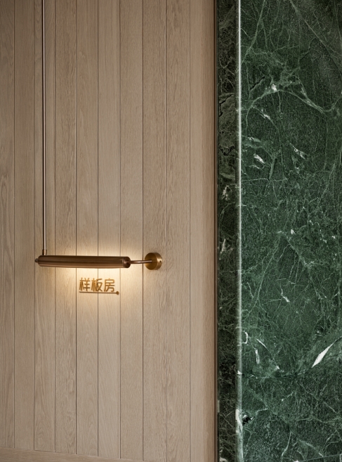 空间的构思始于惯常,用微观的情思去将每一个图景串联,简洁的立面与清冷的山石交映在温润的木饰面,线状延伸解构如框景,亦梦亦真。在光影间折射成一片自然之色。自然温柔的原木,纹理曼妙的大理石,时间随着光影在缓缓流动......