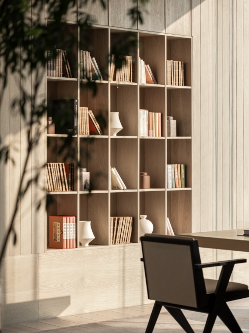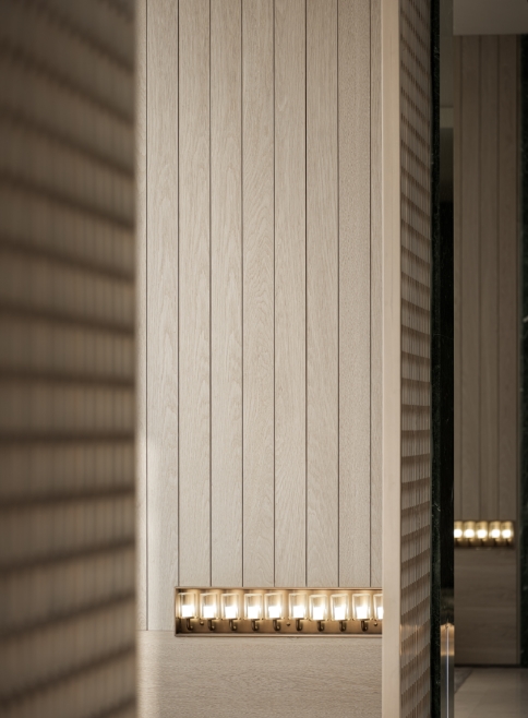 “隐”作为空间展现方式,木栅栏完美实现了中轴对称的设计初衷。立柱正面浅色木饰面与横竖交错的方格交相辉映,提供具有品质和细节感的舒适。